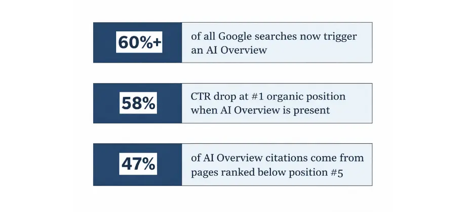 The business impact is immediate and measurable. Research tracking 25.1 million organic impressions found that when a Google AI Overview appears, the #1 organic position suffers a 58% drop in click-through rate.