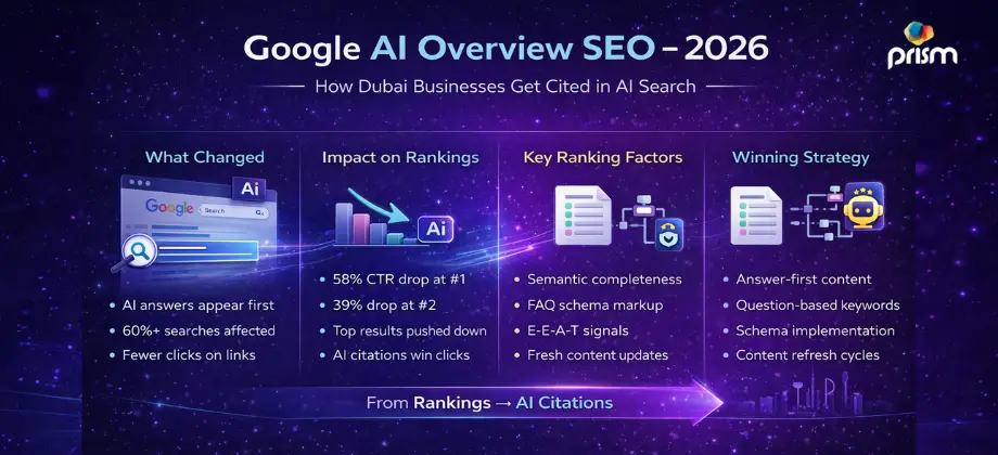 Cited brands earn 35% more organic clicks and 91% more paid clicks than uncited competitors on the same results page. That advantage compounds over time as AI Overview presence strengthens domain trust signals. If you want to understand where your site currently sits and what it would take to appear in Google AI Overviews for your core queries, a structured audit is the right starting point. SEO services in Dubaibuilt specifically for how search works in 2026 — not 2022 — is what Prism Digital delivers for businesses across the UAE.